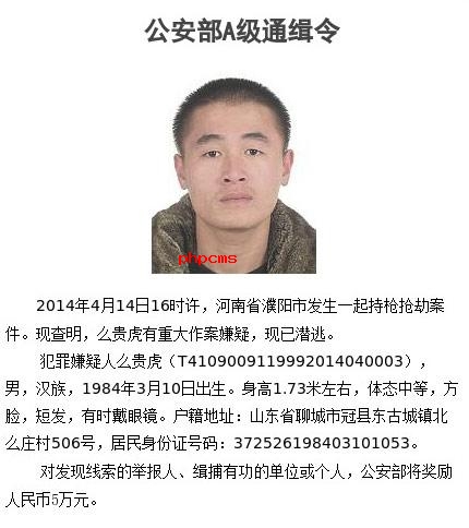 [國內(nèi)新聞]據(jù)公安部刑偵局官網(wǎng)微博消息,2014年4月14日16時(shí)許,河南濮陽發(fā)生一起持槍搶劫案。現(xiàn)查明,么貴虎(男,漢族,1984年3月10日出生,身高1.73米左右,體態(tài)中等,方臉,短發(fā),有時(shí)戴眼鏡)有重大作案嫌疑,現(xiàn)已潛逃。發(fā)現(xiàn)線索的,請立即報(bào)警!對發(fā)現(xiàn)線索的舉報(bào)人、緝捕有功的單位或個(gè)人,公安部將獎(jiǎng)勵(lì)人民幣5萬元。