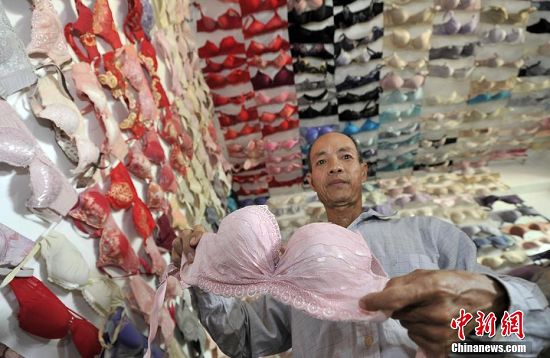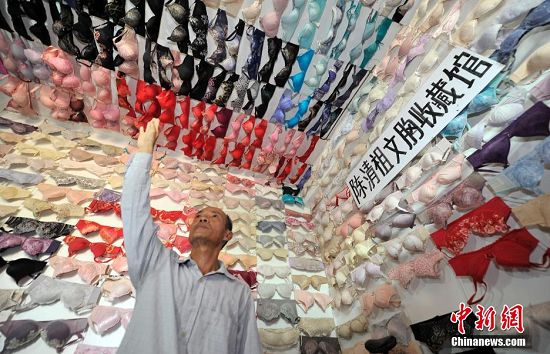 [國內(nèi)新聞]4月21日,海南省三亞市崖城鎮(zhèn)的陳清祖花費20年時間收集5000余件文胸,在一間棟不起眼小房間的墻壁上、天花板上掛滿了各式各樣的女性文胸,數(shù)量多達(dá)5000余件,而這些令人目不暇接的“藏品”來自全國30多所高校的女生。據(jù)陳清祖介紹,他的夢想是將來打造一間文胸收藏館,通過展示內(nèi)衣,提高全社會對女性乳房健康的關(guān)注度。圖為陳清祖展示他的“特別藏品”。