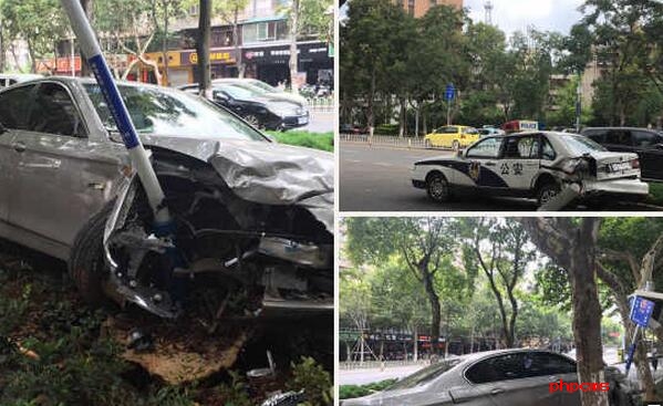 8月12日清晨7時(shí)40分時(shí),昆明市環(huán)城西路與氣象路交叉口,一輛寶馬車突然撞向兩輛停在路邊的巡邏警車,又沖上綠化帶撞倒監(jiān)控桿,最后撞上行道樹才停了下來(lái)。所幸,沒(méi)有造成人員傷亡。