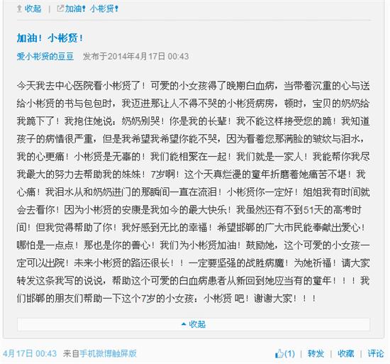 “愛小彬賢的豆豆”是女孩的微博名稱,她寫了一段話私信了邯鄲之窗微博,她記錄了看望小彬嫻的整個心理動態(tài),她希望用自己的方式給予小妹妹精神上的支持與幫助,她愛小彬嫻,所以她會一直在小彬嫻身邊。